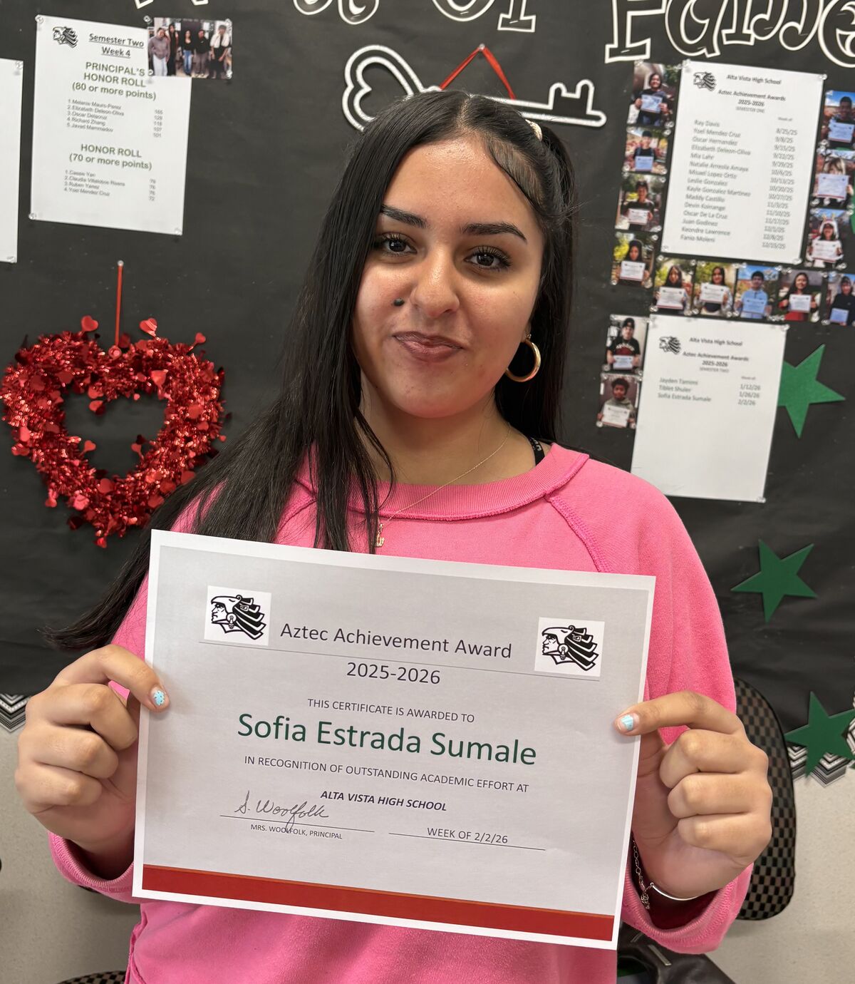 In the words of our Alta Vista teachers, Sofia has been awarded the Aztec Achievement Award for the following outstanding values and characteristics: