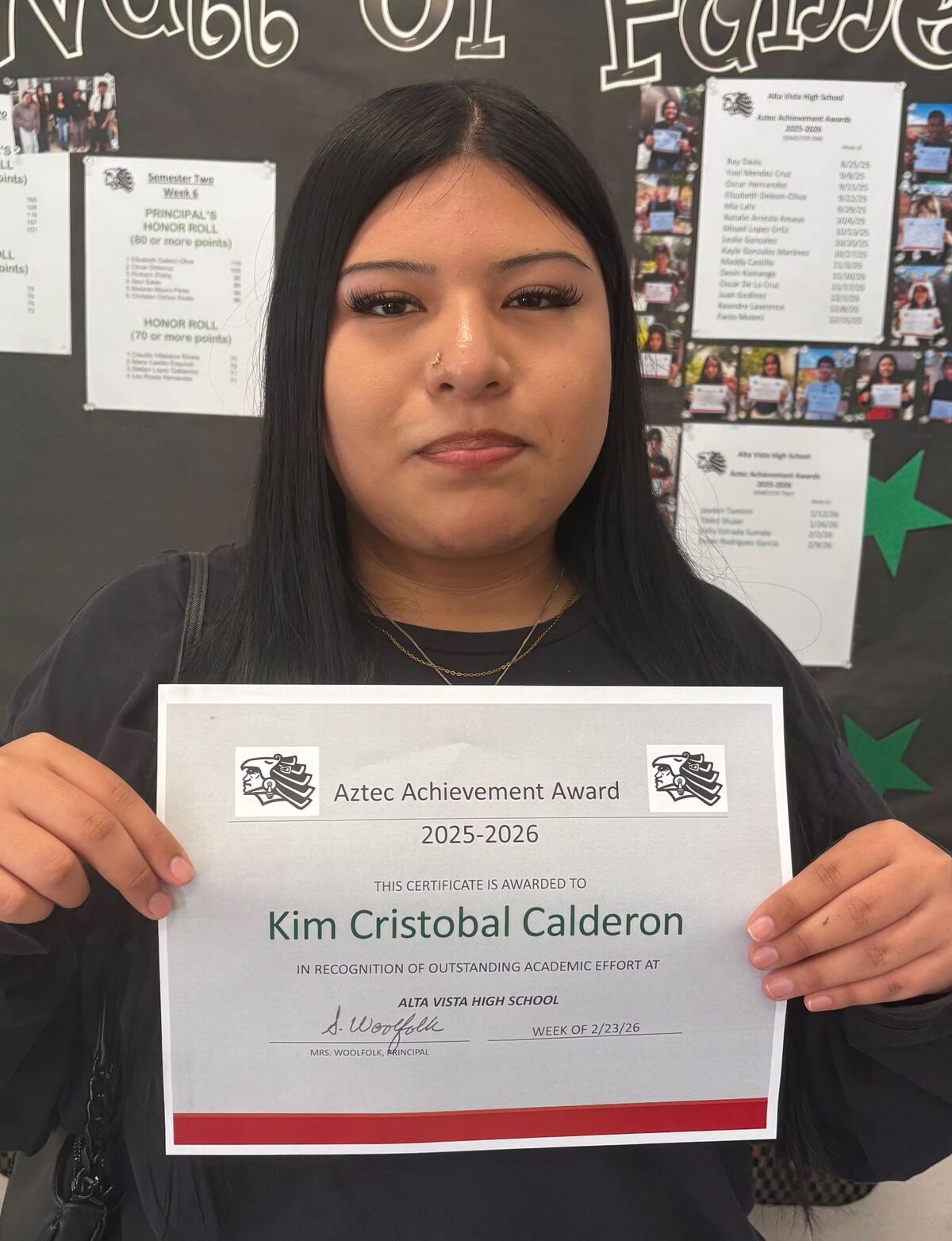 In the words of our Alta Vista teachers, Kim has been awarded the Aztec Achievement Award for the following outstanding values and characteristics: