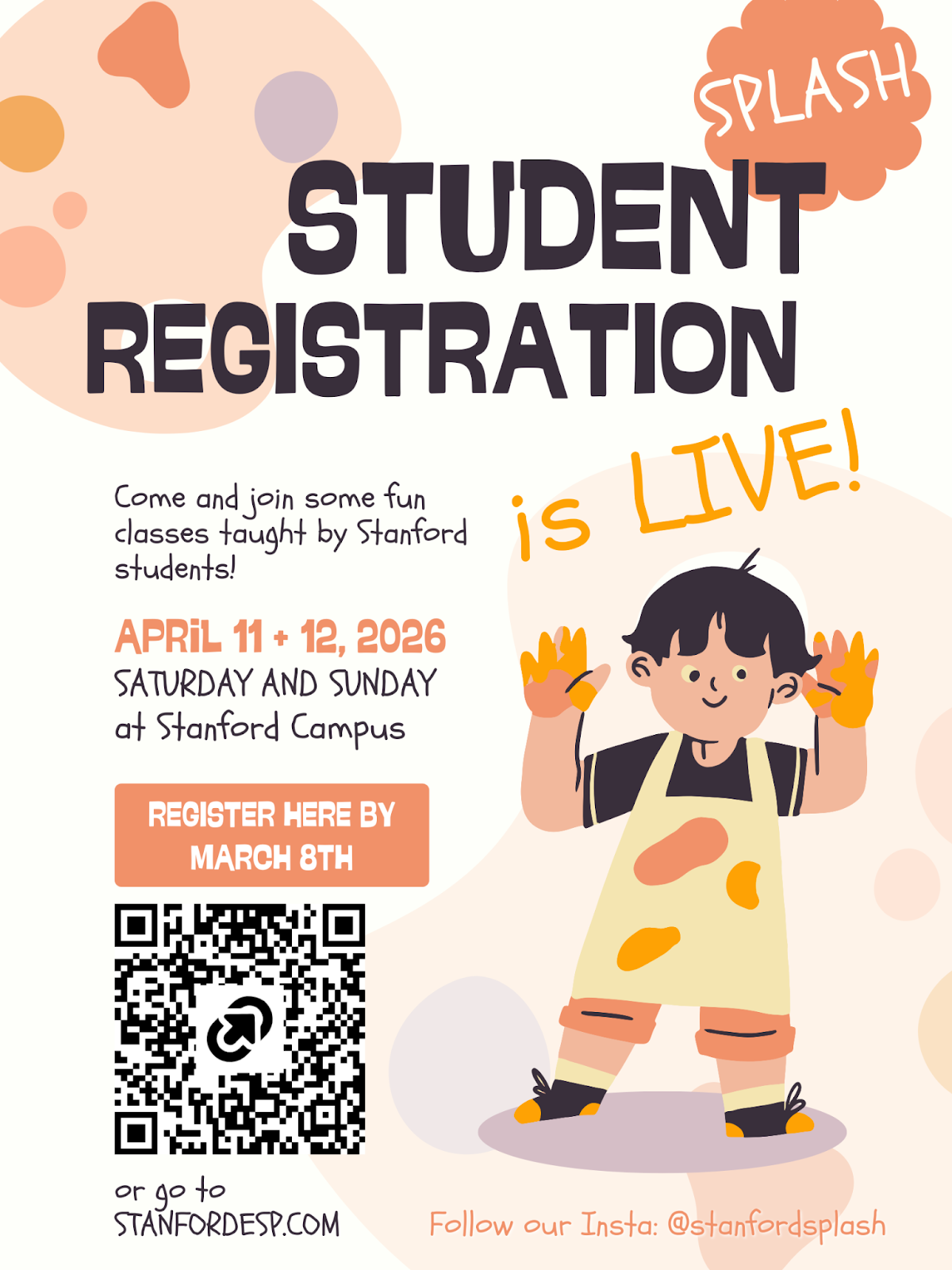 The Stanford Splash Spring 2026 Program will be taking place on 4/11-4/12 on the Stanford University campus! Splash is a program where Stanford students teach classes to high schoolers on anything and everything! With classes like Intro to Journalism, Poetry Workshops, Cooking With Chemistry: the Science of Food, and Juggling 101, Splash offers a wide variety of classes designed to get students excited about learning! If you're interested in participating in our upcoming program, please make an account and sign up through our website (https://stanfordesp.org/).