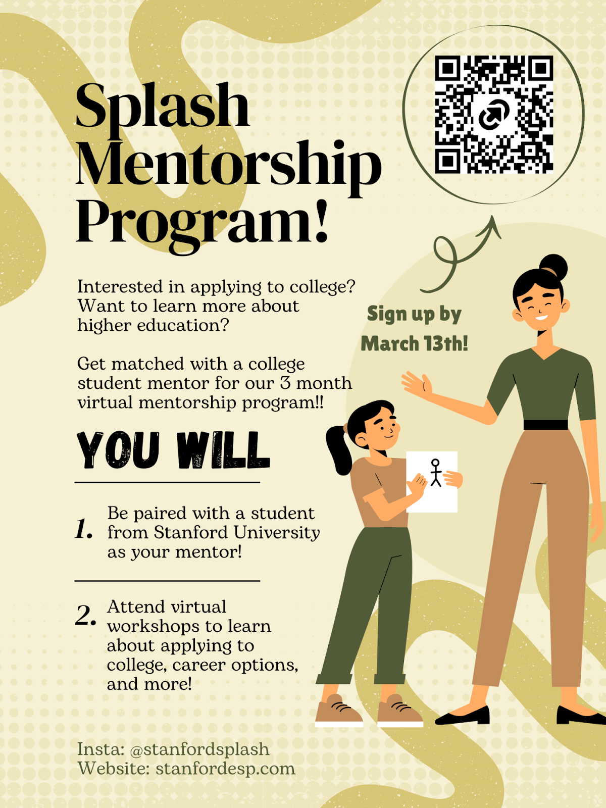 Interested in going to a community college or four-year college? Looking for a mentor to talk to you about life as a college student? You are invited to join the Stanford Splash Spring 2026 Virtual Mentorship Program! Over the course of three months (April through June), we will pair you with a current Stanford student based on your academic interests and backgrounds, and you will meet with your mentor once a month over Zoom. You can talk to your mentor about anything: attending community college vs. a four-year college, applying to schools, and finding jobs after college. Please fill out this form by Friday, 3/13 at 11:59 pm if you are interested!