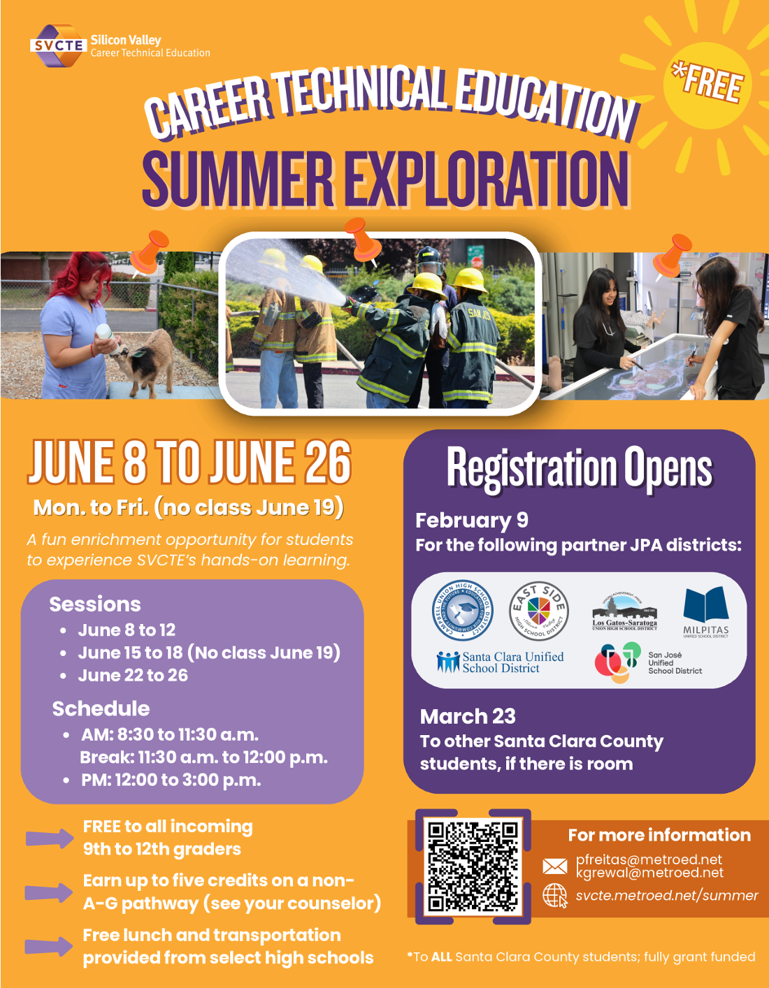 Silicon Valley CTE, the same program we send students yearlong in the afternoons to for career training, is offering summer sessions! This is a HUGE opportunity for you to explore a career in a state-of-the-art school built for CTE, and you can earn elective points at the same time. See Ms. Wallace for more information by Monday - there are limited scholarship spots.