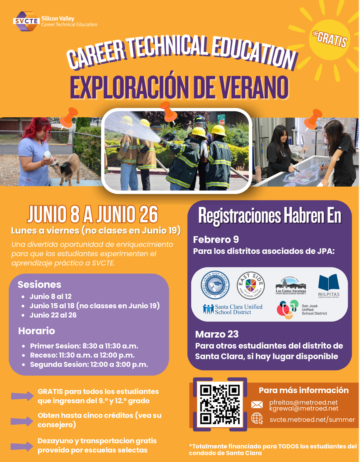 Silicon Valley CTE, the same program we send students yearlong in the afternoons to for career training, is offering summer sessions! This is a HUGE opportunity for you to explore a career in a state-of-the-art school built for CTE, and you can earn elective points at the same time. See Ms. Wallace for more information by Monday - there are limited scholarship spots.