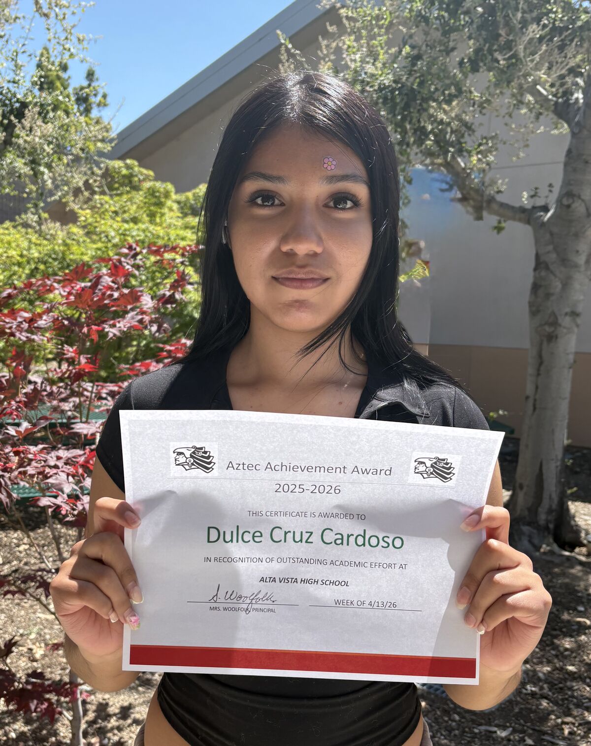 In the words of our Alta Vista teachers, Dulce has been awarded the Aztec Achievement Award for the following outstanding values and characteristics: